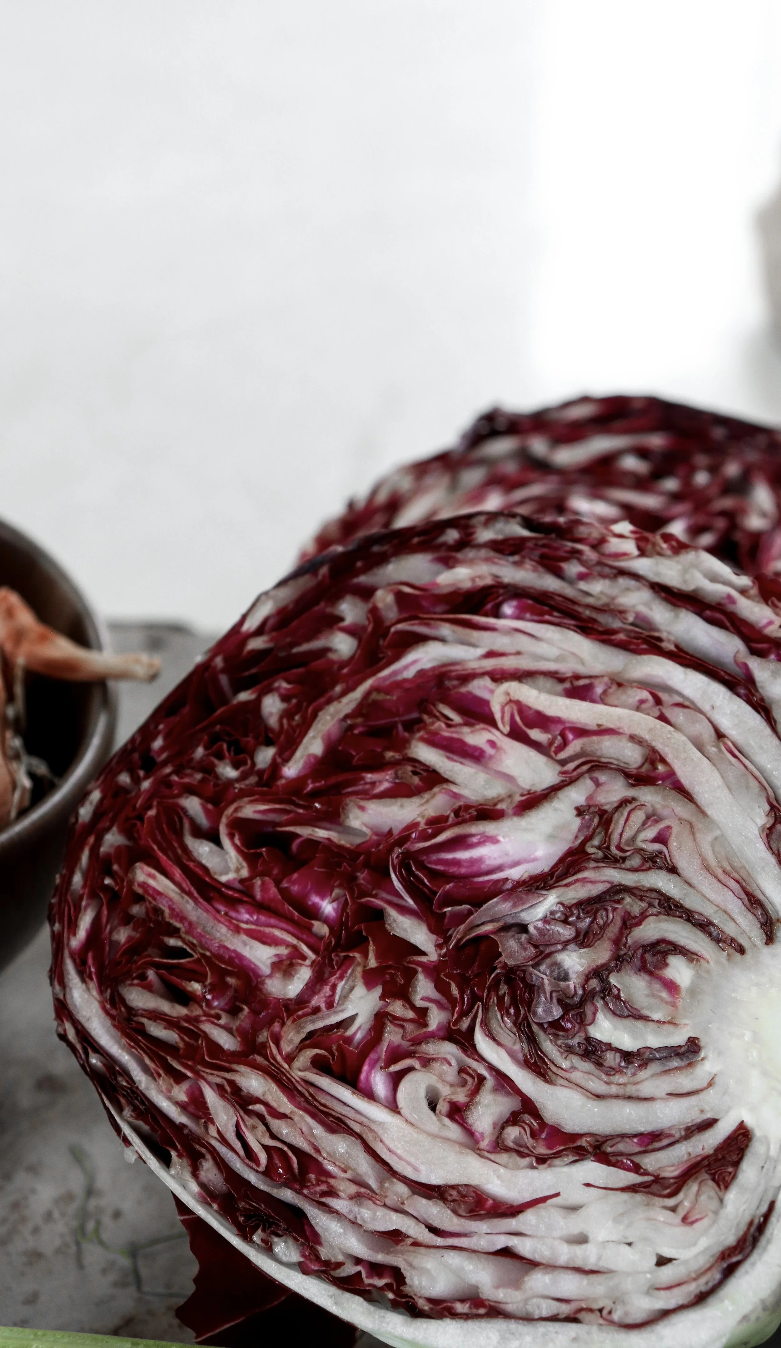 Using a peeler, shave thumbelina carrots in a circular fashion to create ribbons and shock them briefly in an ice bath to ensure that they are crunchy and fresh. Gently pat the ribbons dry with a clean towel (or paper towel) and set them aside. Arrange leaves of radicchio on a plate or serving platter and scatter the carrot ribbons on top. Drizzle generously with the vinaigrette and top with slices (or supremes) of additional blood orange, toasted pistachio and julienned shallot.